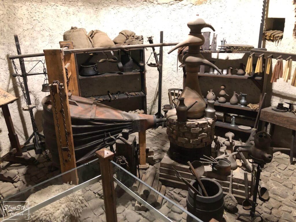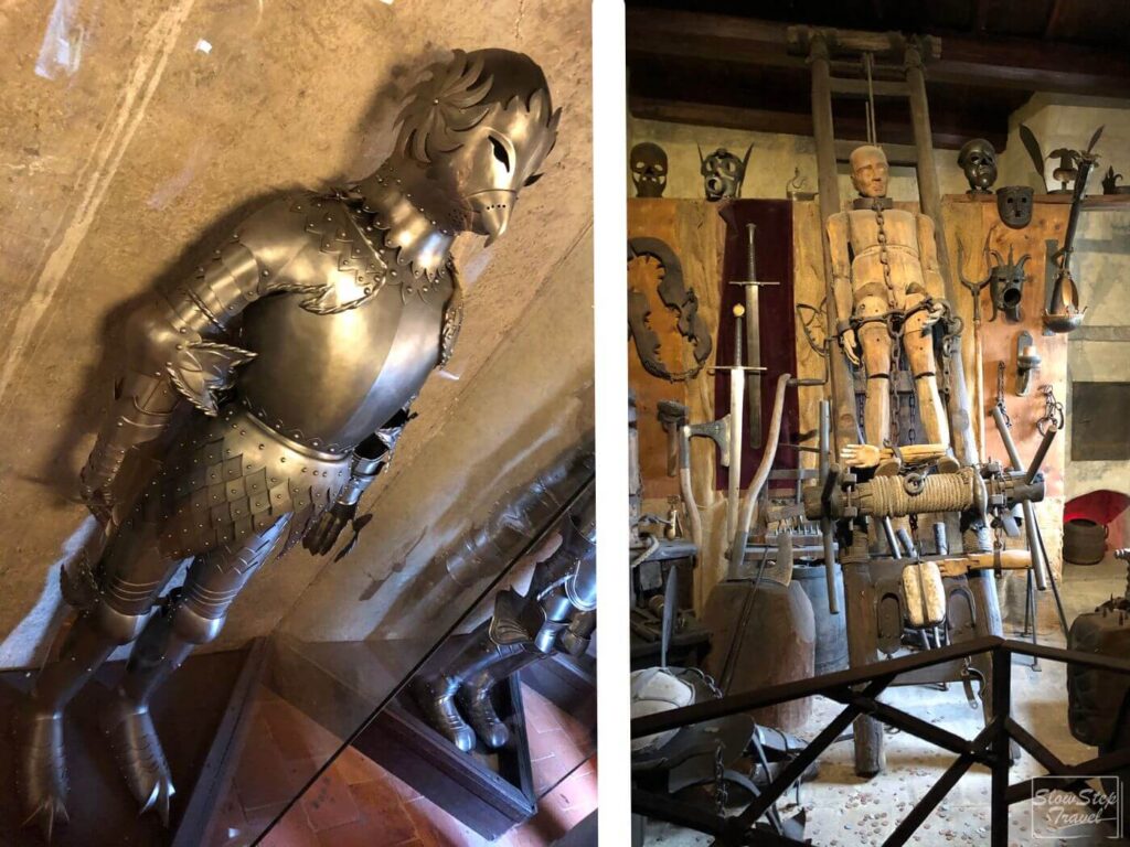 城堡區內除了皇室貴族之外,也住著一群為城堡主人打理一切的僕人與鍊金術師等等平民小老百姓。他們住在城牆的邊緣,一排簡陋小房子內。這些彩色的小房子,有些保留著原始的房間煉金室,裁縫間等等。有些則改成小商店,販售當地的手工藝品。其中最有名的一戶,就是22號藍色小房子。20世紀初最有名的小說家,弗蘭茲·卡夫卡寫作的的地方。據說他待在這邊短短的兩年時間,完成了許多知名的作品,包含了小說鄉村醫生。對於卡夫卡有點興趣的人,我是從最著名的變形記開始。這是部中篇小說,雖然不會花很多時間閱讀,卡夫卡式的超現實卻會在心裡慢慢發酵。至於黃金巷矮房子的2樓,則是全部打通,作為兵器展覽室,展示許多有趣的盔甲裝備,還有一間刑求室裝置,推薦有時間的人可以從側邊的樓梯上樓逛逛。全數參觀完畢之後就由側門出城堡群,沒有回頭路。所以建議最後到黃金巷。