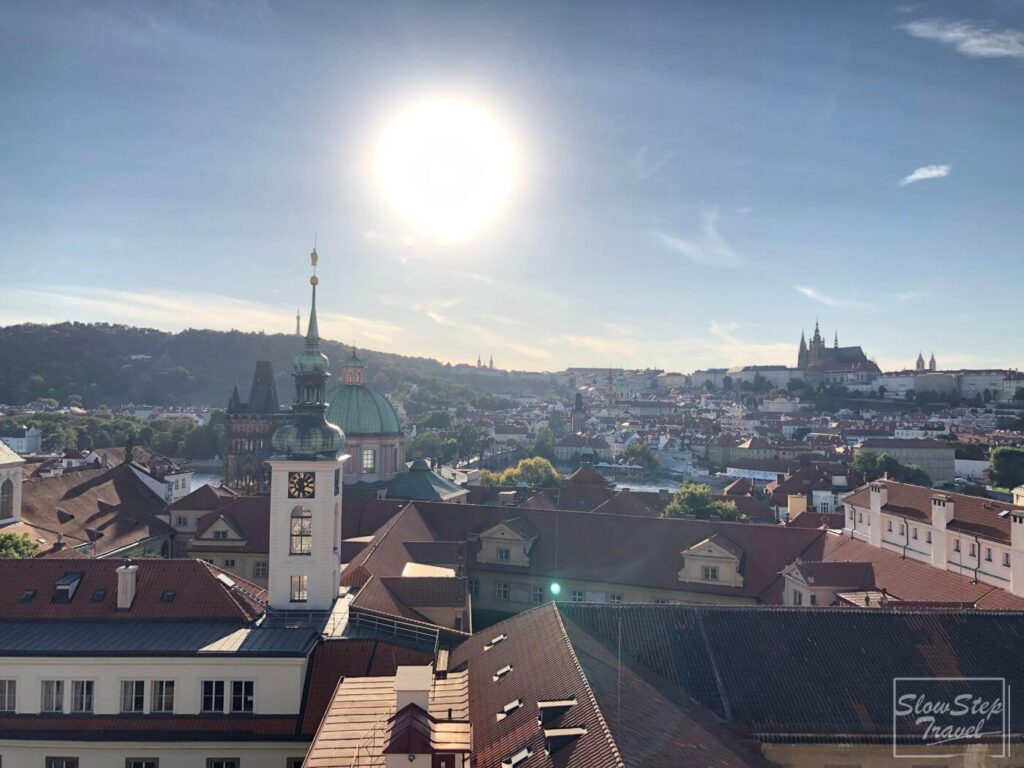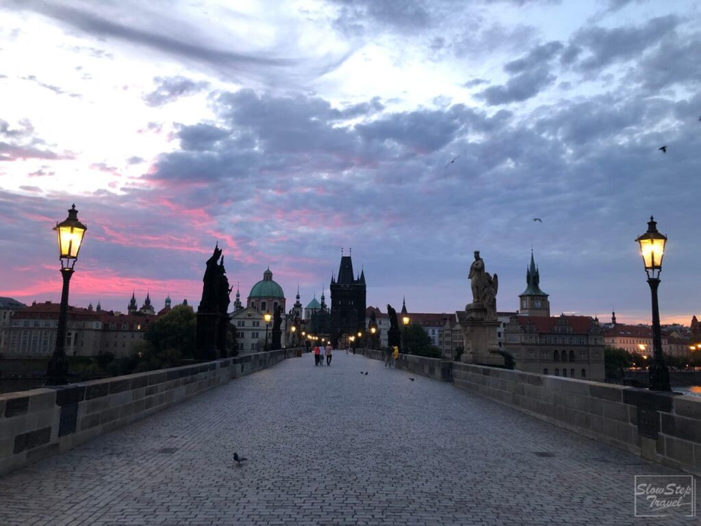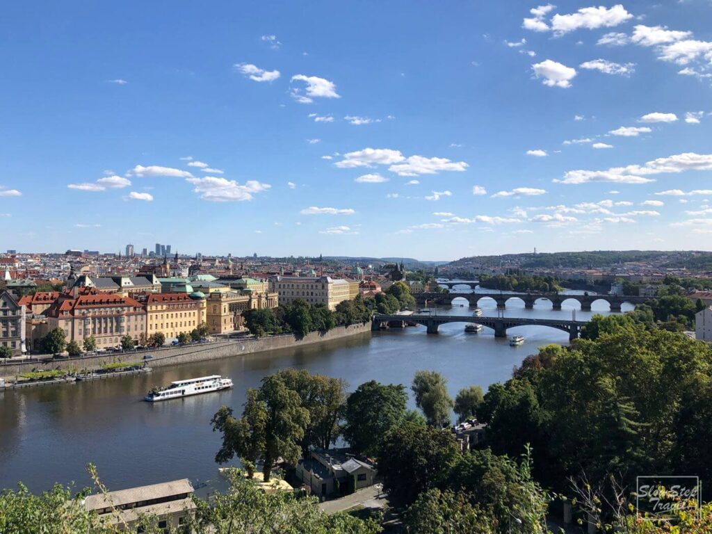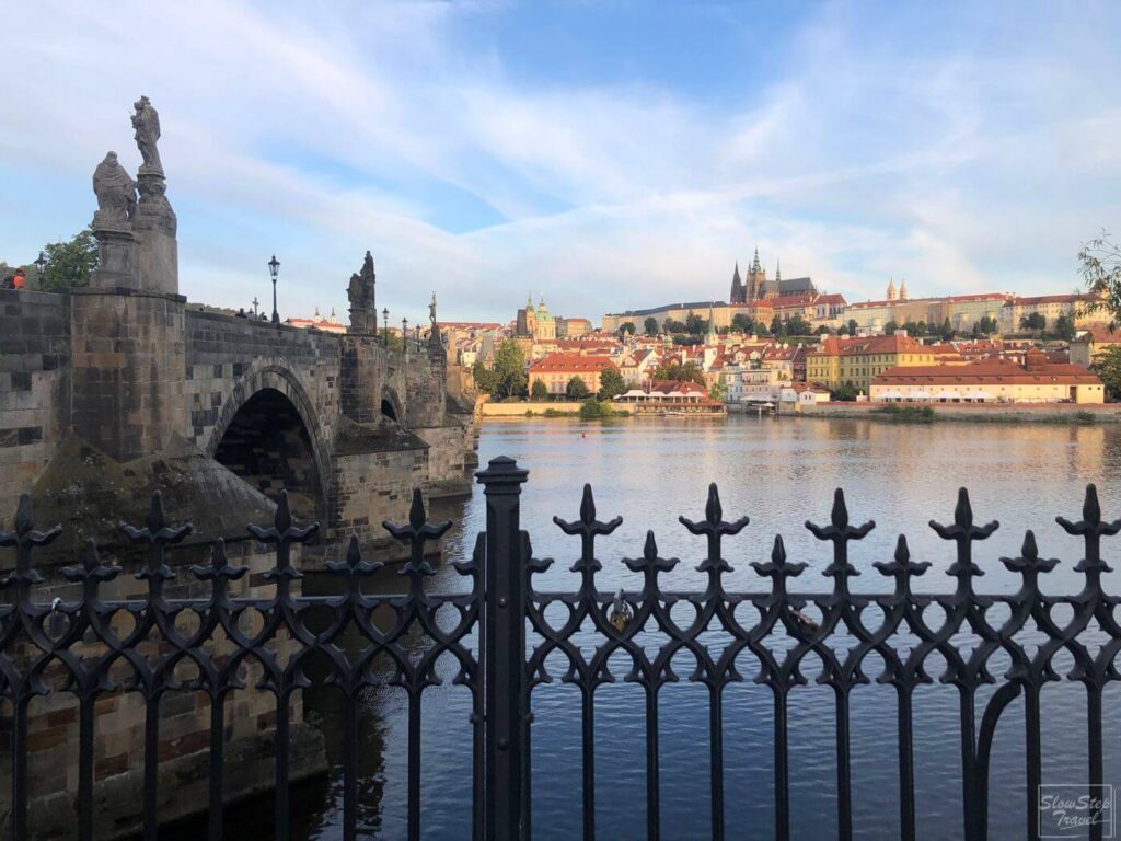 布拉格飯店牆上的掛畫,或是路邊賣的明信片,一定有的經典的伏爾塔瓦河上的三座橋 (馬內斯橋 Mánesův most 查理大橋 Karlův most 軍團橋Most Legií ),心想是應該是攝影大師才把它拍得這麼唯美。查到拍照點之後,無論如何都像要過去看看。搭車下車後,走路約10分鐘不到,就抵達最佳拍照點。第一次過去的時候,天氣不是特別好,灰矇矇的厚雲壓頂,但時不時會透出一點點的耶穌光,撒到到河面上,閃閃發光,也是一種小確幸。只拍了幾張照片後就離開,老實說沒有留下什麼特別印象。幾年過去,非常幸運能再次來到布拉格。應該是平時搭車有讓座,時而買樂透做公益,剛抵達時天氣晴朗,唯一心心念念的景點就是這,立刻決定行李放一放,趕緊搭車上去。不得了,天空非常地清,藍天白雲,興奮地看著河上遊船一艘艘地穿越橋底,小小的輕軌電車跨越小橋,超級可愛的小小世界。而且人群不會像在城區裡面那麼擁擠,坐在涼椅上好好地享受此時此刻。這時才真正地感受布拉格的浪漫美。當老天爺給了好天氣的時候,千萬不可以錯過。