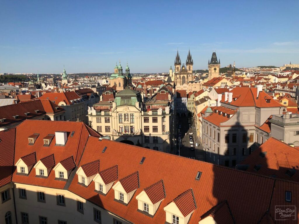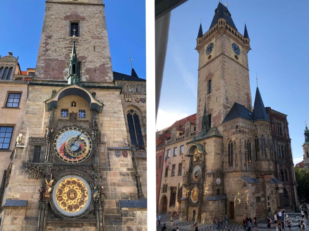 老城區的正市中心,不能錯過保存良好,還在使用的中世紀天文鐘。就位於就在大街旁,每個人可以近距離欣賞。從早上9點到晚上9點,只要是整點,就會有12使徒都輪流出來露面報時。天文鐘有上下兩圈,上面的是天文表面,下面的日曆表面。天文表面上顯示好幾圈的數字與星晨,各自代表不同的意思。要怎麼簡單看懂天文鐘呢?首先找到金色手指的指針指向。最外圈的阿拉伯數字,顯示舊的波西米亞時間,是從日落開始起算,所以跟現在的時間不同。再往內圈看,有羅馬數字白天與晚上的1-12(I-XII),這個就是現在所使用的時間計算方法,但還是要考慮到歐洲地區有日光節約時間,所以有時候會差一小時。接下來往內看太陽指針的指向,有藍天的羅馬數字1-12的標誌,顯示古代巴比倫的時間,也是古老的計時方式。往內的小圈是星象圖,巴比倫人將一年分成12份,各有不同的星象(星座),也是靠著太陽指針當作指示,當作月份的計算。而月亮指針並不指時間,看著球體的銀色與黑色的不同分佈,代表著月亮的圓缺。在下方的日曆表面就相對簡單,外圈有365格,被指針匡起來的就是當下日期。同心圓的正中央的是布拉格城,向外依序是黃道12宮以及波西米亞人的日常12個圖示,跟我們的農民曆有異曲同工之妙,非常有趣。雖然現在科技始終來自人性(懶),即時資料網路上應有盡有,但真心覺得這個非常復古又精緻的天文鐘必須保存下去。小型的紀念品也免不了帶一個回家。天文鐘的塔樓也可以搭電梯或爬樓梯上去觀景台,看看布拉格老城區的市中心。