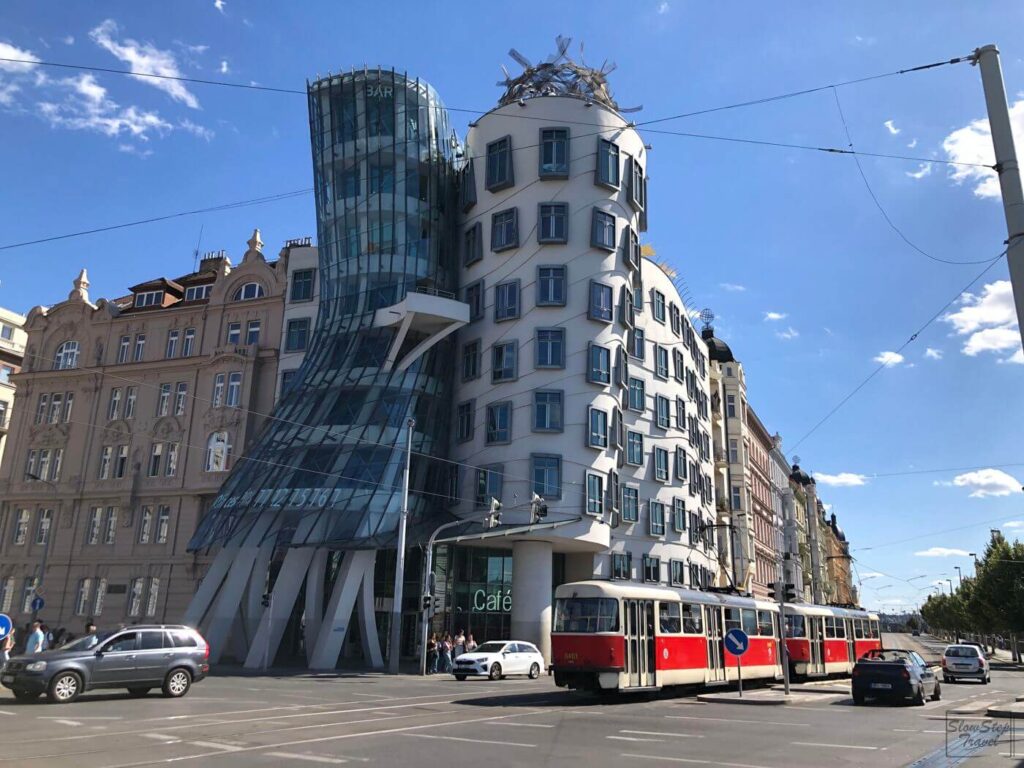 這一棟大樓也是來到布拉格不可錯過的奇特建築,跳舞的房子。就位於弗爾瓦河畔,它本名為荷蘭國民人壽保險公司大樓。據說在二戰時,這邊不小心被美軍誤認為是德國的德勒斯登,因此原址的建築被炸毀。而建築師於1992年重新設計這個新穎的建築,並於1996年完成。大樓扭轉的外觀結構,像似兩個相擁的舞者,彼此飛揚的裙擺。因此大家給這棟大樓起了另一個別名,跳舞的房子。在對向的紅路燈下,總是站滿了慕名而來的遊客,這絕對是拍照最佳景點之一。