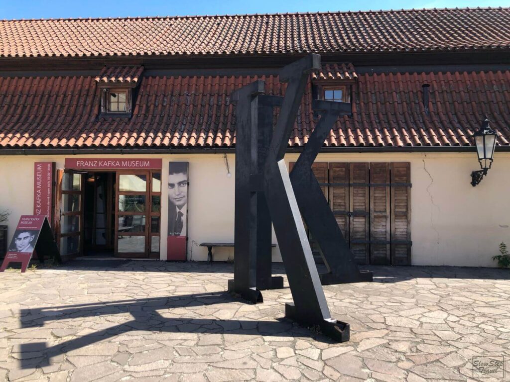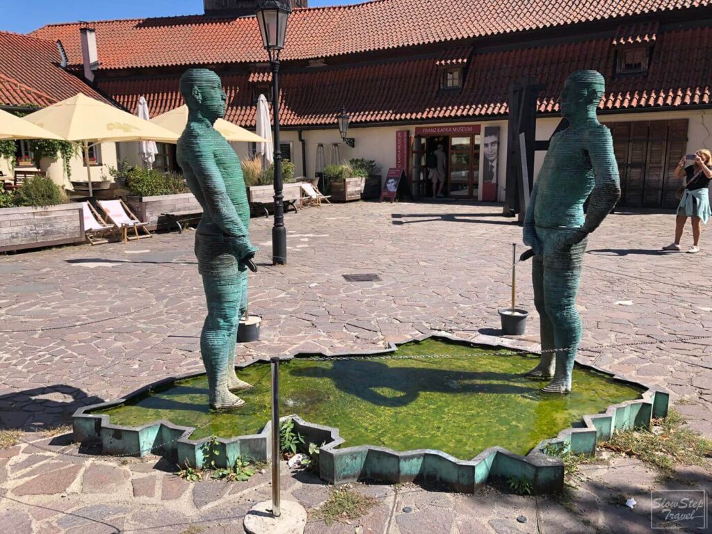 出生於布拉格的弗蘭茲·卡夫卡為奧匈帝國的作家,被譽為是20世紀最具影響力的小說家。整個布拉格城市都在宣傳作家弗朗茨 卡夫卡,從黃金巷內的22號小屋、卡夫卡博物館、雕像、甚至連紀念品,都有他的影子。博物館內裡面有展出珍貴的手稿,圖文照片等等,來了解卡夫卡式的超現實風格寫作風格的背後,是怎樣的成長軌跡。有興趣的大家可以進去參觀。庭院裡面還有一對尿尿大童,對著捷克的領土撒尿,也是頗具諷刺意味的奇特雕像。對面還有一間紀念品小店,應該可以挑到一兩個紀念品帶回家。