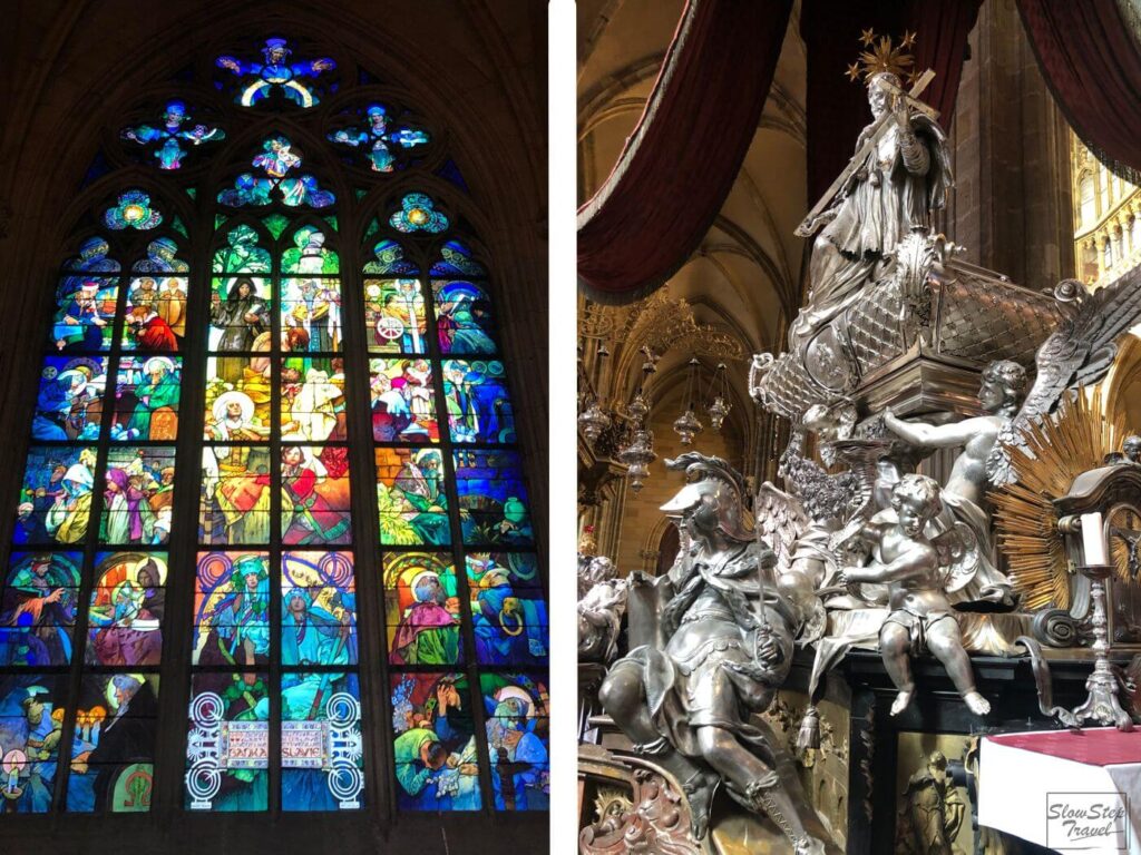 聖維特主教座堂布拉格最重要的教堂,不論是國王的加冕儀式,或是君主聖人大主教等長眠之地,皆在此處。從外觀來看,教堂有兩個入口,一個是教堂南塔這面的黃金大門,牆上用金色馬賽克磚鋪成了最後的審判這幅圖樣,在陽光的照射下顯得金壁輝煌,因此皇室加冕儀式等重要典禮,各方達官顯要都是由此門進入。而一般遊客參觀則是由西側的青銅門進出,官方規劃了單一的參觀路線,完整地繞行教堂一圈後,從原來的大門離開。新式歌德的建築,彩繪窗花,地底下的皇家墓穴,在高聳的教堂內,顯得相當神聖。一踏進教堂就被整個莊嚴的氣氛給震懾不已。但化身為一級旅遊景點後,想當然爾,排隊人潮洶湧,遊客聲鼎沸,當下會感到些許矛盾。但多虧了世界文化遺產的稱號,可以將這個大教堂完整地保存下來並開放大眾參觀,還是要充滿感激之情。可以去找找由捷克國寶慕夏所設計的彩繪玻璃,是欣賞的重點之一。這扇彩繪窗非常有他的個人風格,應該不難找到。還有一座銀色的巨大棺木,外觀精緻顯眼,這就是聖約翰・內波穆克的棺木。是後人為了紀念他高尚的情操,不願屈服於國王的權威,誓死也要保守皇后的秘密。這是來到布拉格,一定要知道的故事。最終當然是以悲劇收場,被割掉舌頭後從查理大橋丟下。大家為了紀念這個偉大的信念,在布拉格的其他角落,都找得到相關的紀念雕像。