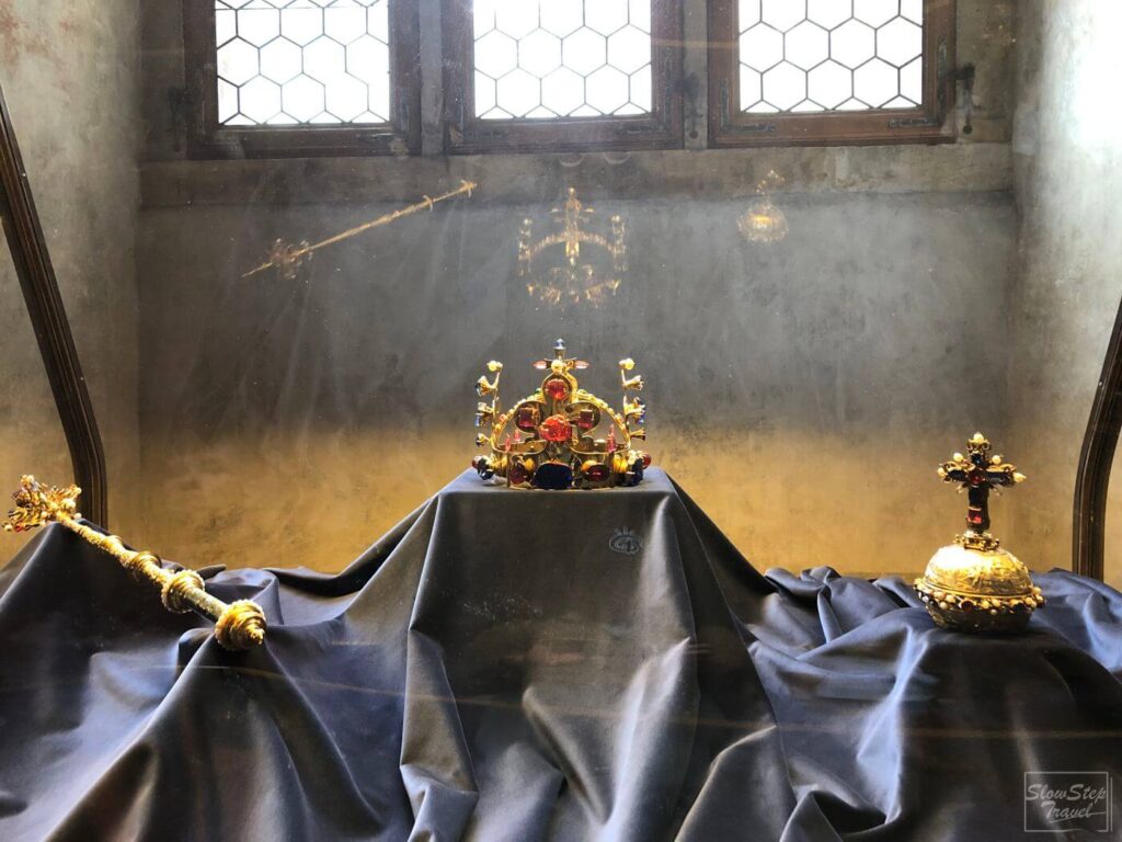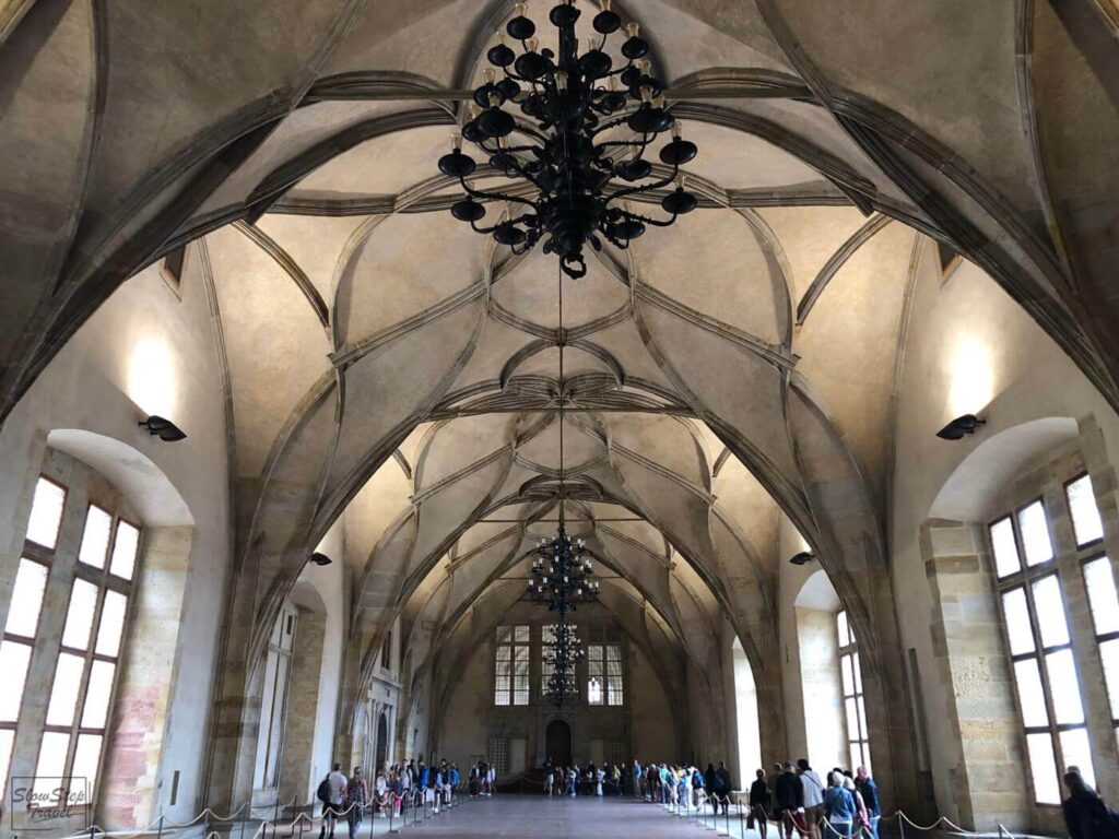 舊皇宮就在聖維特主教座堂的對面,原為木造的住宅,隨後在原址上建造了一座哥德式的宮殿。中間因皇室遷出,被遺忘了近一世紀之久。當政權重返這座皇宮後,便開始進行大型的重建工程。而宏偉莊嚴的弗拉迪斯拉夫大廳就此誕生。個人覺得最值得參觀的就是這個大廳,挑高的拱頂天花板,有著花瓣的造型,雖然不走華麗風格。卻是非常典雅。要離開時,才發現出口是由騎士樓梯所組成,比較寬大,是當時為了讓騎士可以直接騎馬進入大廳,進行馬術比賽所設計的。側邊的房間有展示波希米亞皇冠複製品與圖騰旗幟,看著自己不熟悉的圖案,也是滿有趣的。