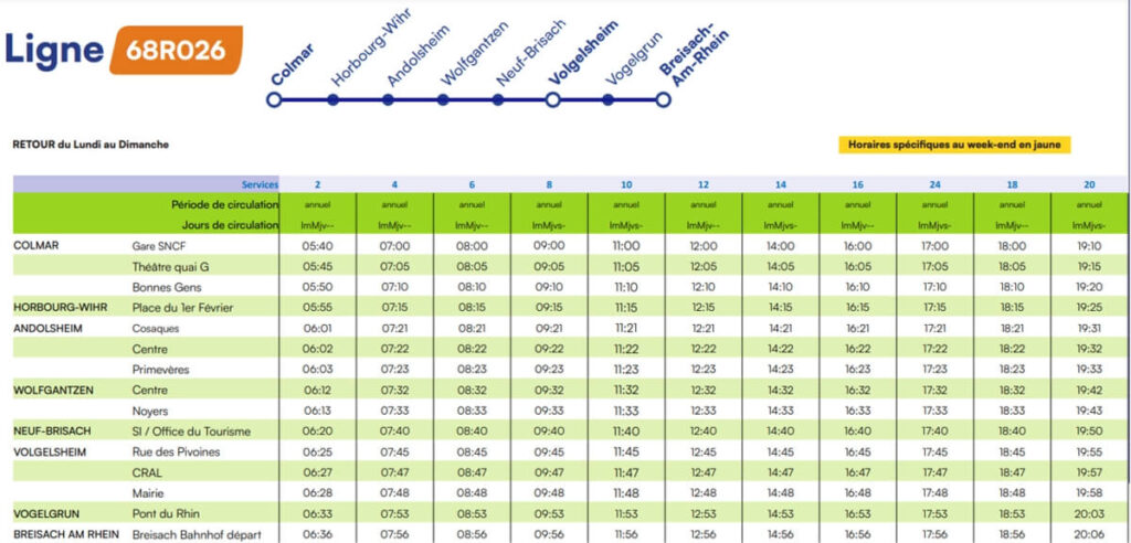 - 從Breisach站搭乘R026公車到Colmar Théâtre Quai F站,約50分鐘。上車向司機購買單程票,單程票4歐/人。