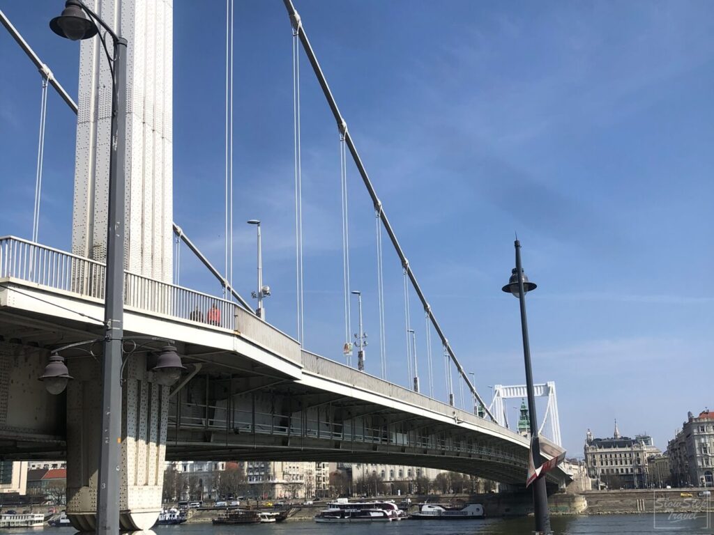 伊麗莎白橋,是為了紀念匈牙利人民最愛戴的匈牙利皇后伊麗莎而命名,也有人稱做茜茜公主橋。建在多瑙河的最窄處,跨度僅290公尺。不要看它現在走一個時尚簡約的風格,在當時(原)伊麗莎白橋可是被譽為歐洲最美橋樑之一,這才配得上茜茜公主,世界最美皇后的稱號。殊不知這些多瑙河上的橋梁們命運乖揣,同樣不敵戰爭的無情,在二戰末期被摧毀得體無完膚。當重建計劃開始後,主要因交通運輸量後續看漲,所以使用全新的設計,在原址上重建一座設計簡約版本的伊麗莎白橋,並於1964年通車。現在只留下相同的名字與舊照片來懷念過去的美好時光。