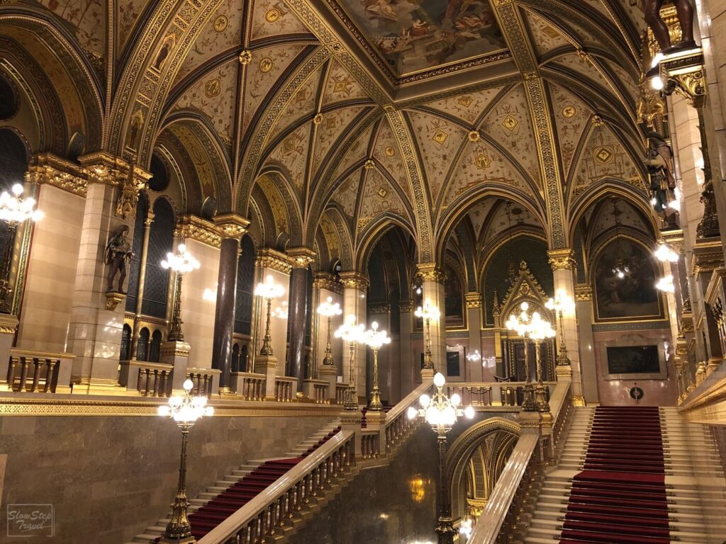 匈牙利國會大廈是布達佩斯的重要地標,第一印象只能用壯觀來形容,光是建築物的長度就超過200公尺,是匈牙利境內最大的建築物。採用兩側對稱,外觀呈現哥德式的設計,中間卻又有文藝復興時期的常見的圓頂。由於建築物本體十分巨大,想要全部入鏡,最佳的拍照點會在多瑙河的對岸,或是搭乘遊船欣賞,來感受建築之美。內部主樓梯的鋪上長長的紅地毯顯得尊絕不凡。一定不能錯過就是匈牙利國王的皇冠,連同權杖、王球、寶劍,放在星空般圓頂的下方,由2個目測身高超過190以上的帶刀衛兵所保護,要注意不可拍照。能清楚看見皇冠上的十字架是歪的。有這麼一說,由於多次的搬動,不小心被撞歪的,所以就順勢保留這個形式至今。這次剛好遇到匈牙利國慶日,國會大廈開放免費參觀,就跟著大家一起排隊入場。此次參觀的區域只有主樓梯與圓頂大廳下的皇冠。正式的官方導覽還會參觀其他議會房間與漂亮的窗花,建議提前一個月就要預定參觀票券,才不會錯失良機。