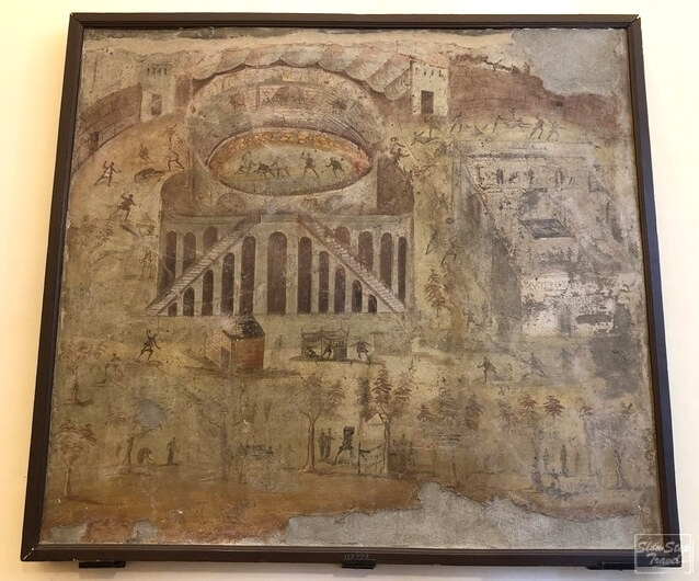 但是在西元59年間,在競技場外發生了龐貝人和諾切拉人之間的鬥毆,所以禁止競技場活動長達十年之久。可由壁畫的內容證實這段歷史。走進隧道般的通道,進入競技場的場地。放眼望去,高人一階的觀眾席,而這麼廣大的競技場,卻只有2個出入口,心情很複雜。想想勝利者才可以在群眾歡呼聲中活著出去,生存真不容易。
