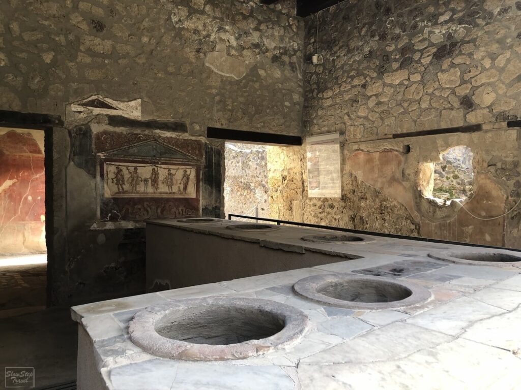 前面有好幾口的爐子,準備料理食物。後面的櫃子擺放食物及飲料,可供客人選購。其實龐貝滿多間房子,只要探頭進去就可以看到煮飯的爐子,不是特別稀奇,而這家因為是做餐飲店的,所以有特別多口爐子。