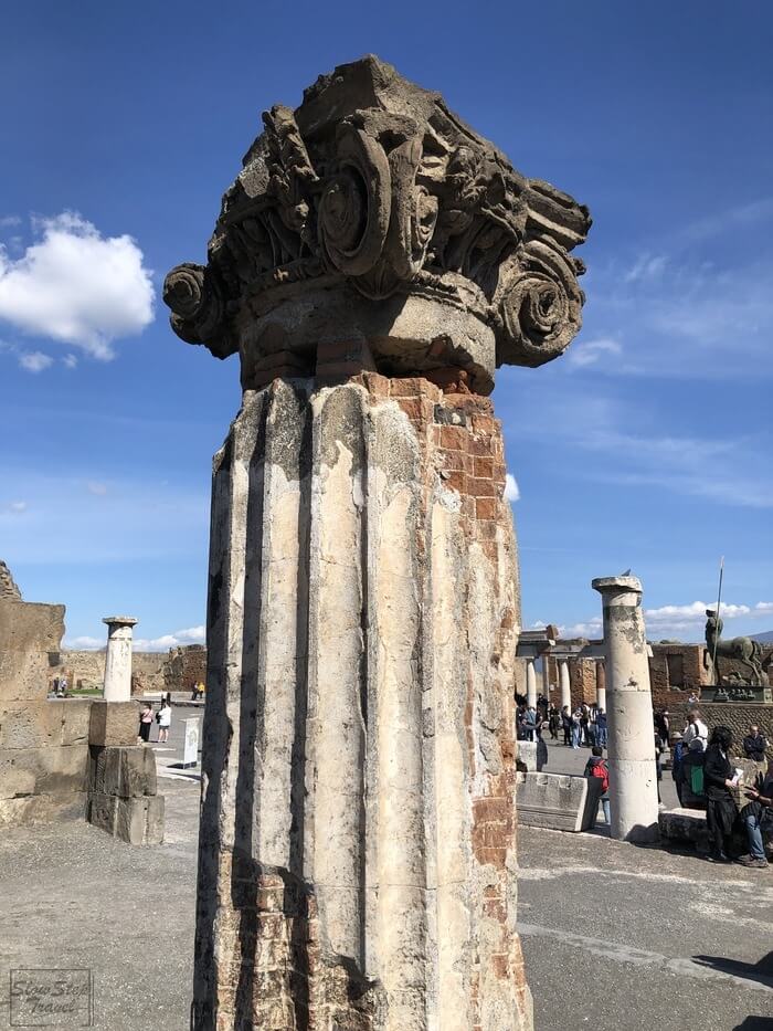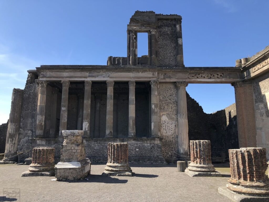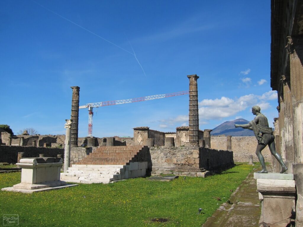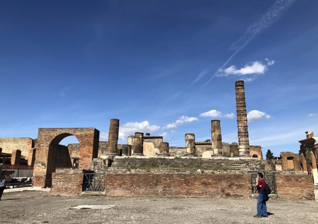 在龐貝廣場上,有一座地基被墊高起來的神廟,就是朱庇特神廟。根據宗教信仰的文化,裡面供奉的是朱庇特、朱諾和密涅瓦三大神像。雖然現在剩下幾根柱子孤單的立在上頭,但底下廣場總是人聲鼎沸,不知兩千多年前的景象是否也是如此。