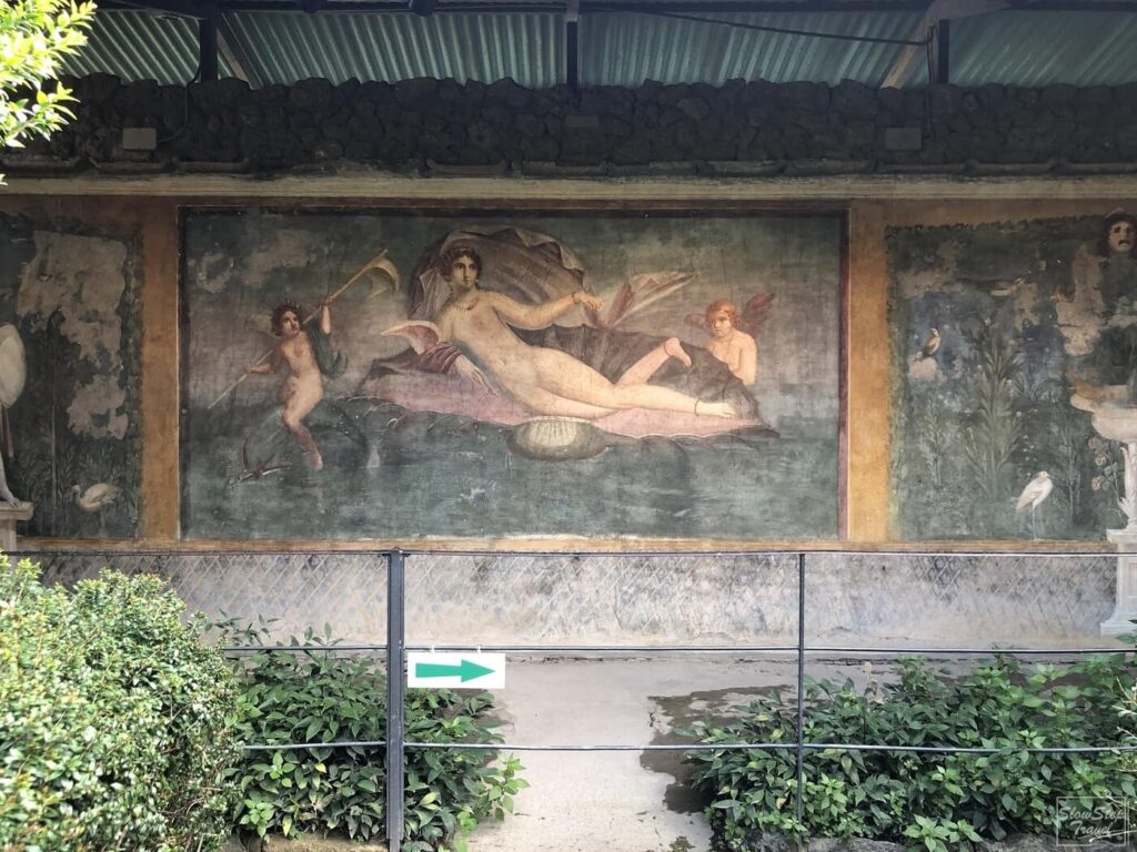 花園裡面一片綠意盎然,牆上有一幅巨大的壁畫,描繪著女神維納斯在貝殼中躺臥著景像,所以這間宅邸因此而得名。
