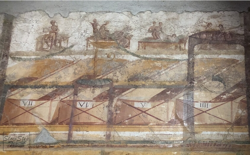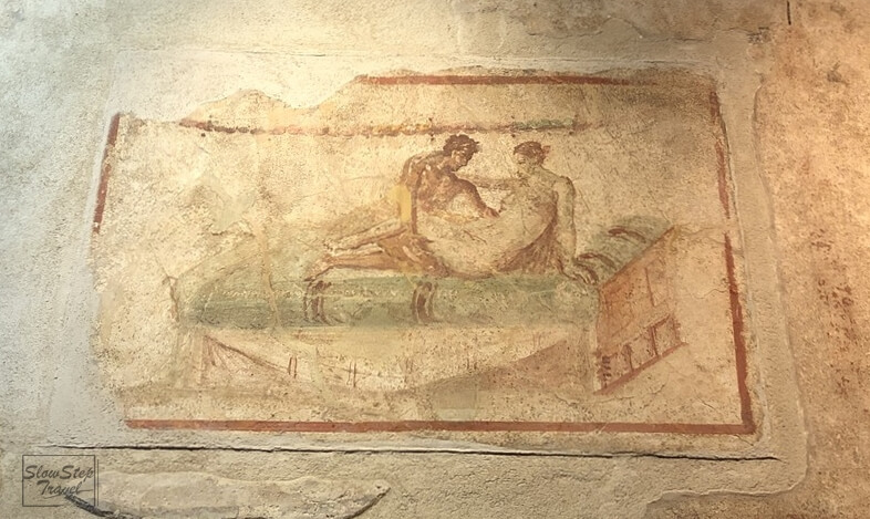 這種現代人認為的特殊行業,於當時可是蔚為流行。整個城市有高達25家妓院之多,目前只有一間開放參觀,所以列為必看的景點之一。小小的一條通道,擠滿了想要一探究竟的遊客,想進去還得排隊呢。裡面總共有10間房間,一樓5間,樓上也有5間。牆上有讓人臉紅心跳的壁畫,大多都是奴隸替人服務。而有錢人是不會來這種地方,因為他們家中都有奴隸。