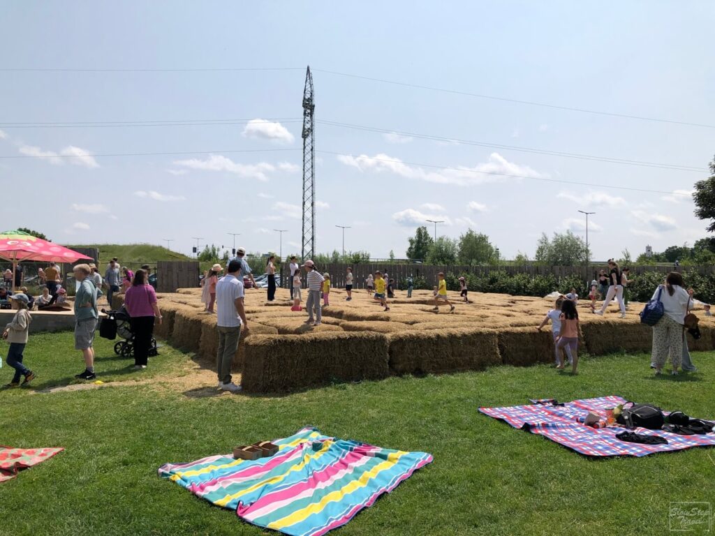 由於我們是初體驗,一開始就被小販部的園區給吸引。這邊專門視為家庭所設計,有稻草堆迷宮,小水池、小孩友善的遊樂區。裡面的小孩都玩得超開心地。小販部也是各類飲調、蛋糕、冰淇淋、熟食通通都有,非常方便。當然,早到的鳥兒有蟲吃,可愛陽傘下的位子早就座無虛席。而大家也很習慣鋪張野餐墊,撐起陽傘,很自在地待好待滿。反觀沒有帶野餐墊的我們,只能躲在屋簷下的草堆的桌椅區,喝著草莓奶昔,享受一下初夏微風。