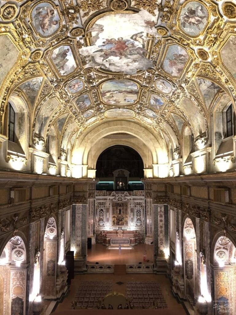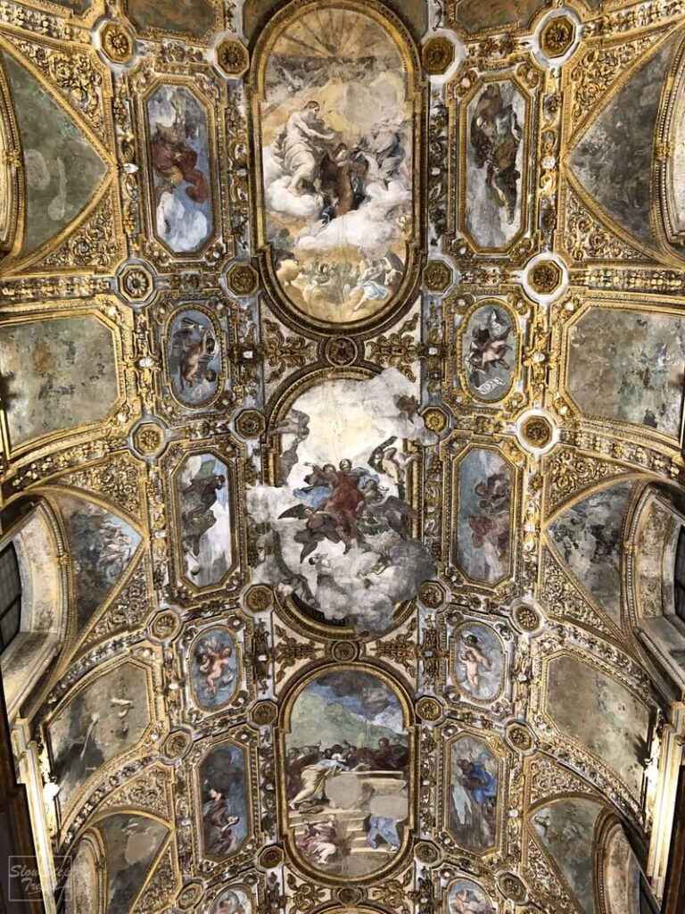 踏入教堂大廳的那個瞬間,立刻就被裝飾華麗的大理石牆面與金碧輝煌的天花板給吸引。大廳中央有擺上紅色絨布椅,感覺將有場演奏會在這舉辦。樸實的教堂外觀,讓人完全猜不到裡面竟如此豪華。真心覺得義大利教堂裝飾的浮誇程度,理所當然地到了另一個境界,簡直是宗教藝術的天花板。鏡頭都不知道要專注在哪個方向,就是一股腦地按下快門,回家之後檢視照片,張張精采。如果再逛個幾間教堂,審美觀就要回不去了。