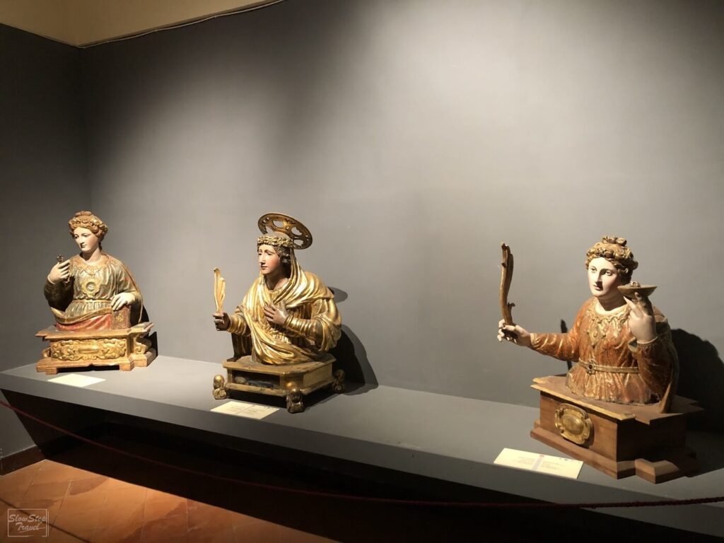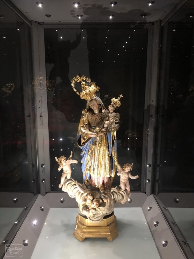 已經被教堂大廳的華麗所震攝。接著搭電梯上二樓,參觀畫廊博物館,基本上就是沿著教堂四周走一圈的走廊當作展示牆。因為已接近閉館時間,所以遊客除了前面一組外,就只剩我一個人。而且二樓裝的全是感應燈。有時候走得比較慢,在空無一人的空間中,燈光一明一滅的,感覺有點毛毛的。尤其有些宗教畫作有些是描繪耶穌受難及相關畫面,慢慢堆疊起恐怖的感覺,只好越走越快。但後來想想,人在聖光滿滿的教堂裡面,應該沒有什麼好害怕的,是吧。展覽的空間雖然簡單,但是看起來滿有質感的。除了展示油畫, 還有銀器打造的雕像 、聖物等,不少收藏。