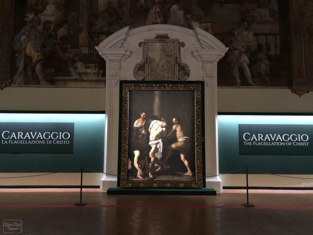 二樓的最後一區,為卡拉瓦喬的特展「基督的鞭刑」。這幅原本是保存在國立卡波迪蒙特博物館內的鎮館之寶。恰巧結束了2022-23 年在巴黎羅浮宮的展覽。在回家之前,單獨為了它在此次舉辦特展,提供一個最佳的欣賞燈光環境,讓參觀民眾更能體會大師想要表達的意象。整個空間只在正中央擺了這張大型畫作(286×213 cm),燈光打在畫作上,周遭相對昏暗,企圖使大眾目光停留在畫作上。畫作像是有一道光打在基督身上,能清楚看見受到他的哀傷神情與肢體動作。其他惡人的舉動,皆躲在陰暗的那面。在相機的自動調色下,還勉強可以看到。但人站在畫作前,親自用肉眼看,其實是很難分辨到底有甚麼躲在光的背後。完全呼應了雷普利(Ripley)裏頭,神職人員提到卡拉瓦喬的作品,「光,永遠要有光」。在那一刻的感受,真的就是這樣。