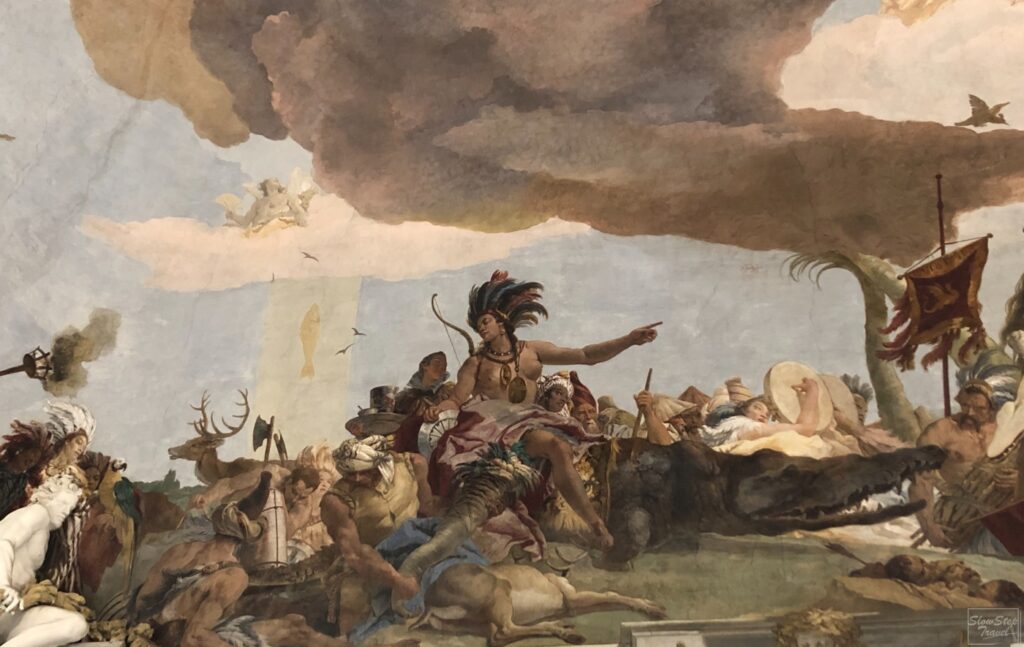 美州 : 上面一團烏雲,代表女性帶著原住民印地安人的羽毛帽,指向代表烏茲堡的旗幟。而代表動物是裡面唯一一個具有攻擊性的鱷魚。有斧頭以及人頭,並在火烤動物或人的肉,明顯是未開化的野蠻人世界。這幅18世紀的畫作,其實對於美州大陸的描述是不符合事實的。