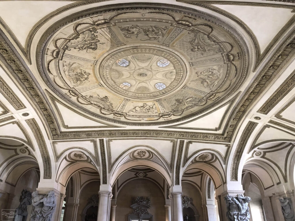 整趟的王宮導覽之旅最精彩華麗的房間。整間粉紅色大理石灰泥與鑲金圖案裝飾著大廳,挑高的天花板,一邊畫得是腓特烈一世,號稱巴巴羅薩,舉行第二次的婚禮,當時還需要得到教皇的祝福以正式認證。而另一頭的壁畫則由國王來選擇教宗,這些錯綜複雜的政治權力的移轉,真的是很難在一時之間理出頭緒,就當作是在欣賞名畫。抬頭淨是2D與3D畫作與灰泥的裝飾,精心設計的小細節,讓人看得眼花繚亂。一個轉頭,真誤以為有一隻狗站在柱子上呢。