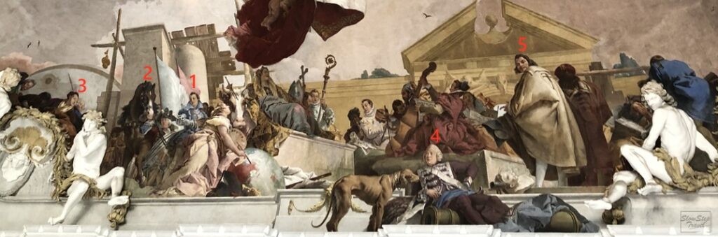 歐洲 : 代表人物穿著華服的女性(1),旁邊有馬作為代表(2)。還將參與此建築並有代表性的建築師畫家(3、4、5)等,留在畫作上以茲紀念。
