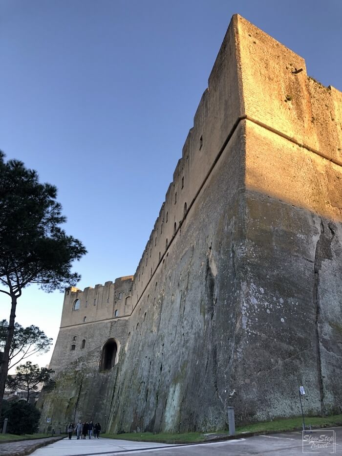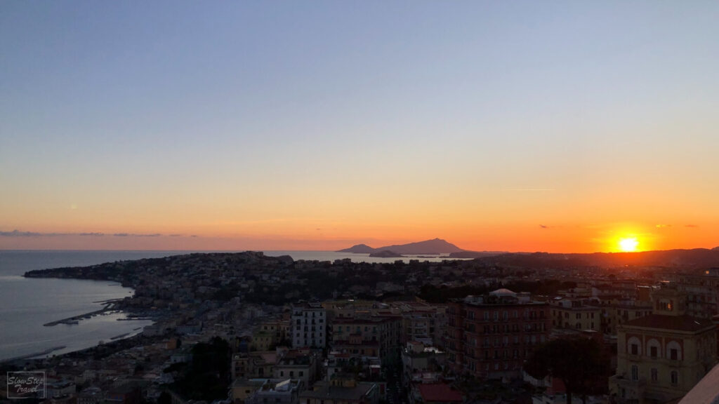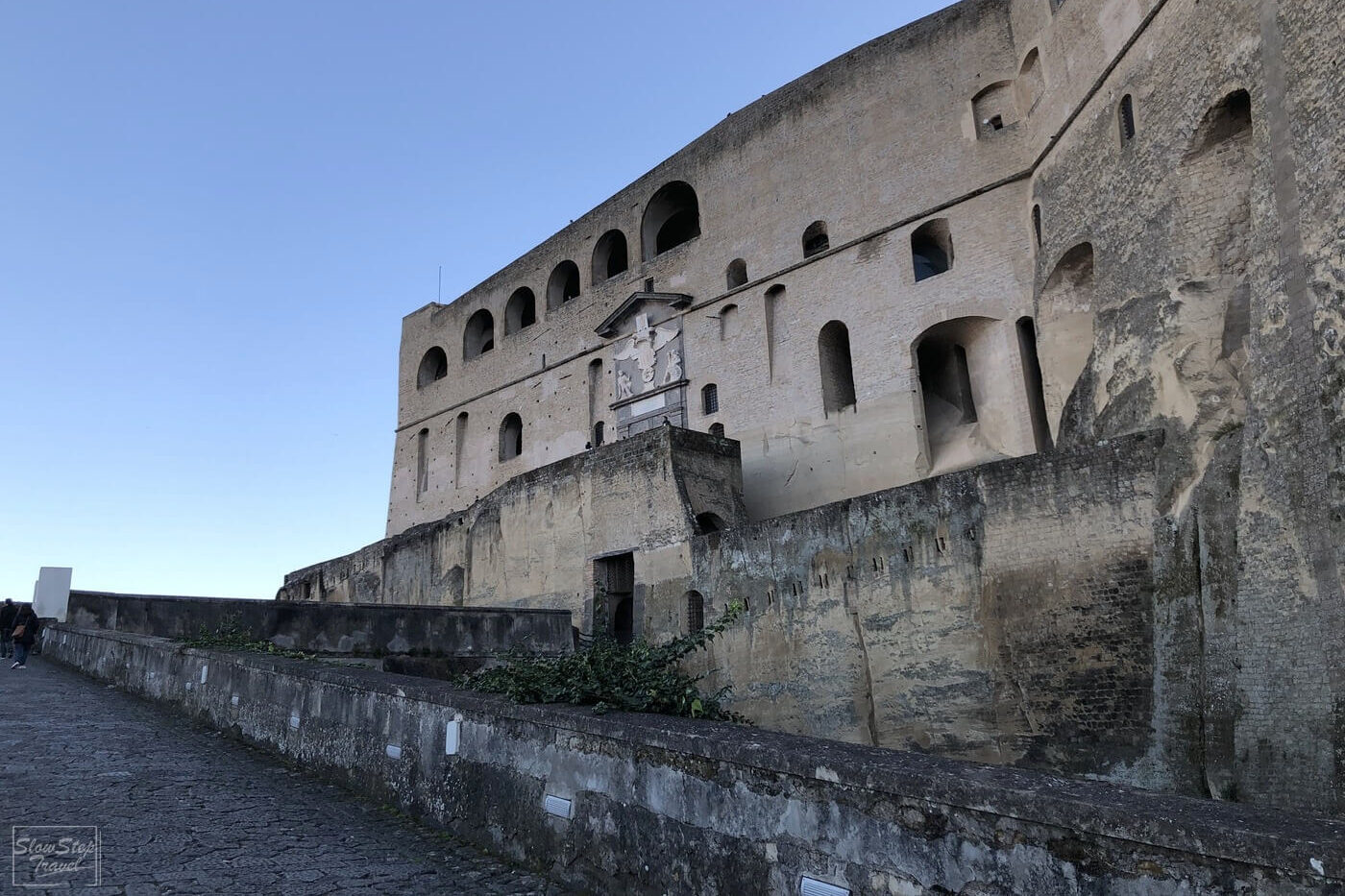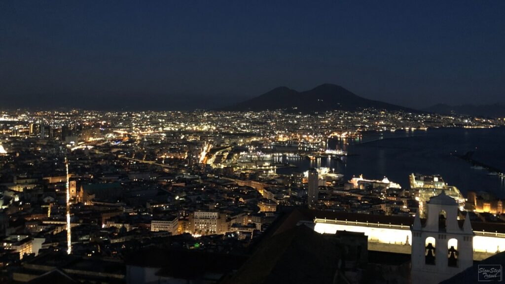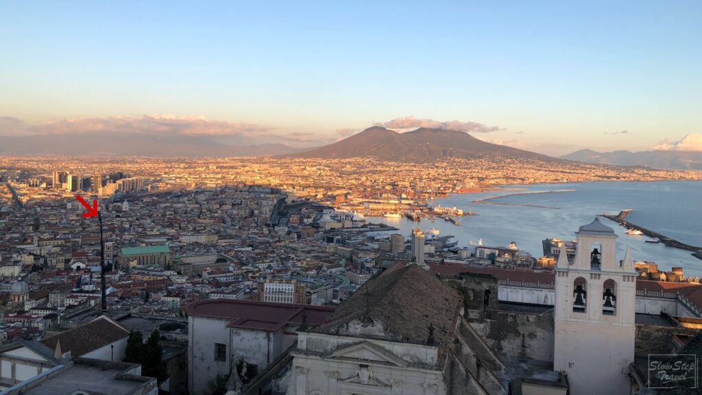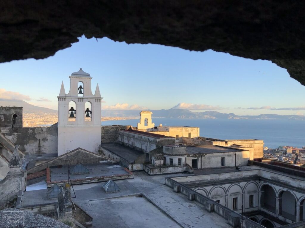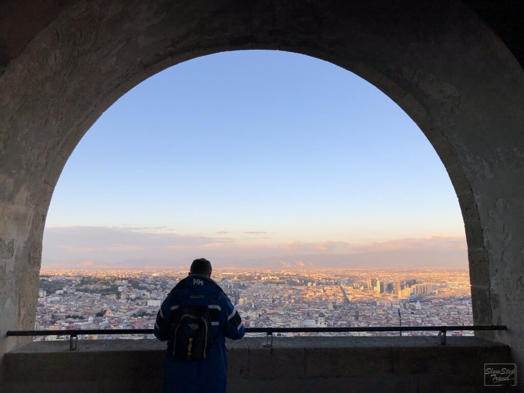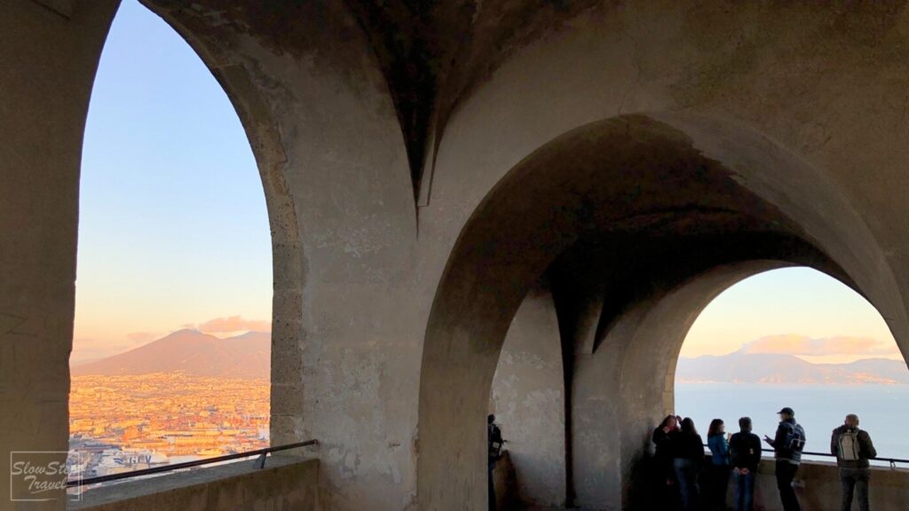 入場後從城門處一路盤旋向上,途中時不時可以透過拱形的窗台,俯瞰市區與海岸線的美景。當然巨大的維蘇威火山也是不容忽視的存在。有這麼美的景色,所以不論是白天或傍晚都非常多的遊客來此欣賞拿坡里的美。