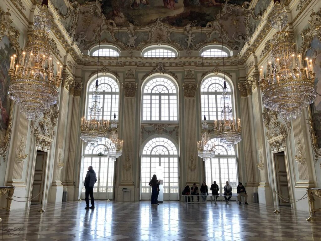 從驗票口進去,爬上階梯,來到了宴會大廳。第一次看到的時候,只能用眼花潦亂來形容。挑高3層樓高、以奢華的洛可可的灰泥裝飾為框架的壁畫,象徵巴伐利亞洛可可的極盛時期,處處皆藏著小細節,認真仔細觀察的話,會發現很多的樂器作為裝飾。而頭頂上巨大的天花板描繪了奧林匹斯眾神的天堂,同時也象徵著統治者有著維護和平的責任。我覺得最值得一看、也駐足最久的地方。