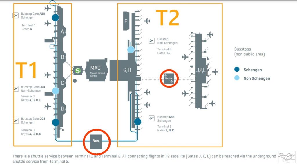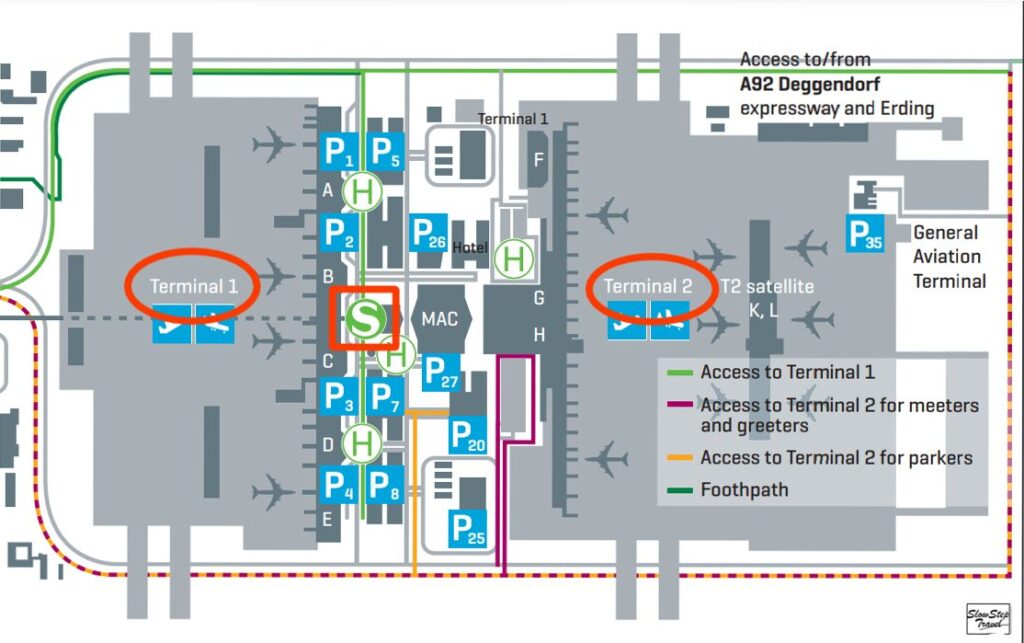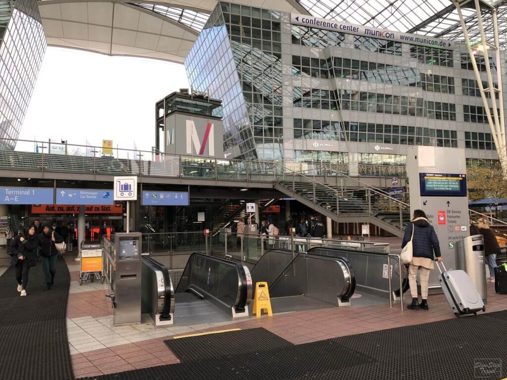 慕尼黑機場主要分成兩個航廈,一航廈 (Terminal 1) 與二航廈 (Terminal 2),且S-Bahn的月台位於一航廈 (Terminal 1)建築物的底下。