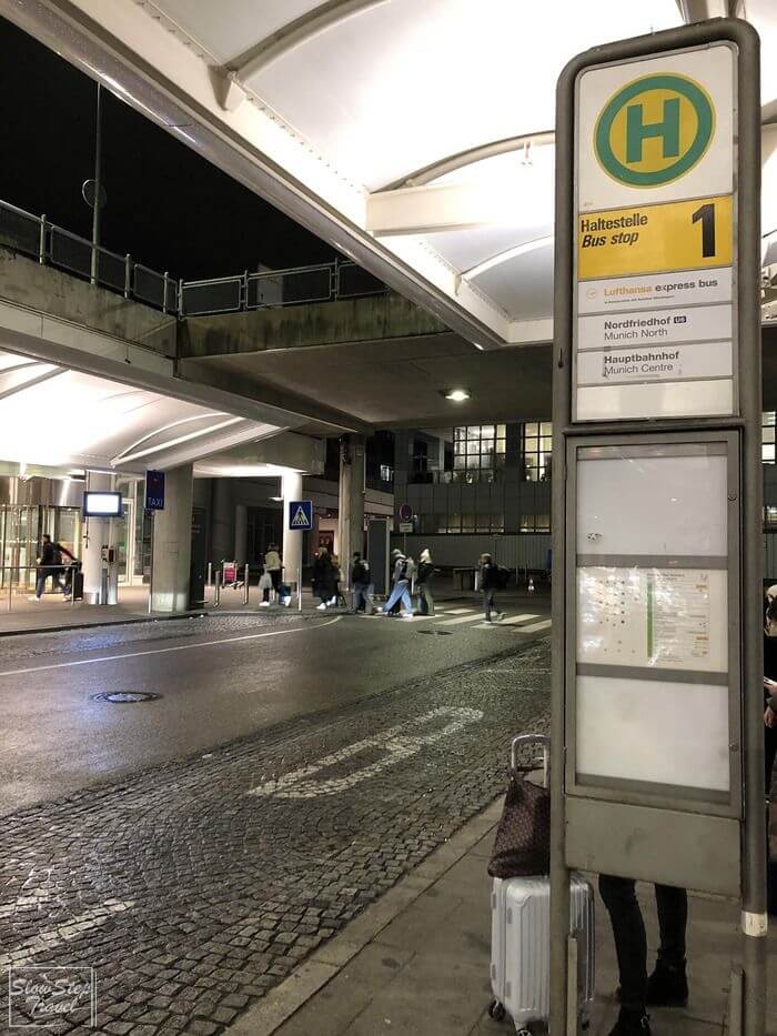 二航廈 (Munich Airport Terminal 2)的搭車點:一走出領行李處後右轉(尚未離開2航厦建築),順著指標走出建築後,就可以看到1號巴士站。